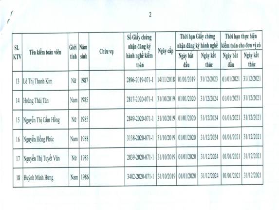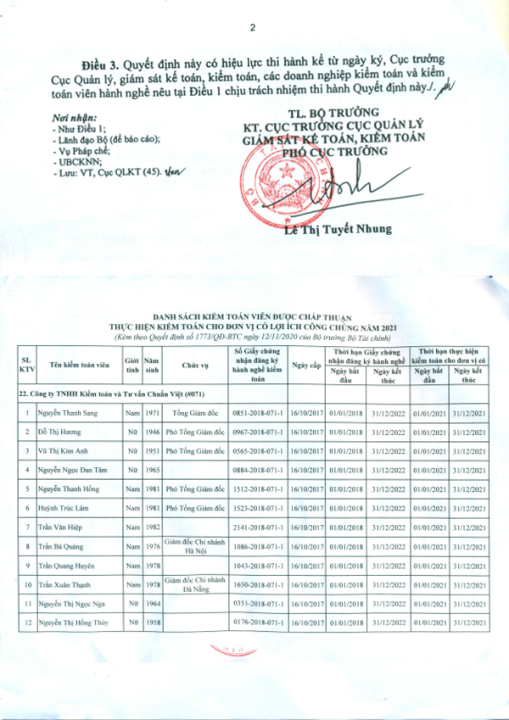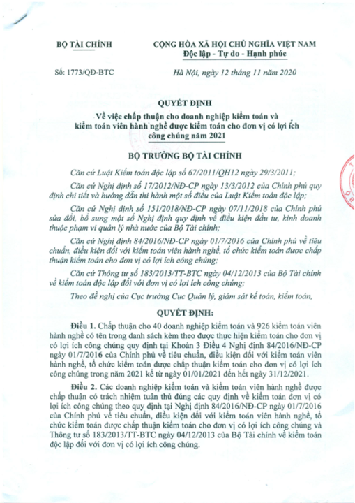Ngày 12/11/2020, Bộ Tài chính đã ban hành quyết định số 1773/QĐ-BTC về việc chấp thuận công ty TNHH Kiểm toán và Tư vấn CHUẨN VIỆT – VIETVALUES, thành viên của hãng kiểm toán JPA INTERNATIONAL, được thực hiện kiểm toán cho đơn vị có lợi ích công chúng năm 2021.