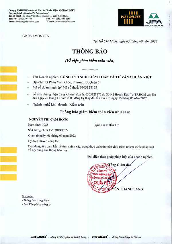 Thông báo giảm Kiểm toán viên 05/09/2022