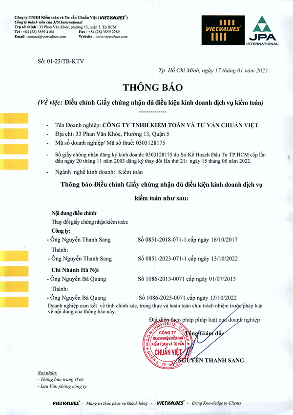 Thông báo giảm Kiểm toán viên 17/01/2023