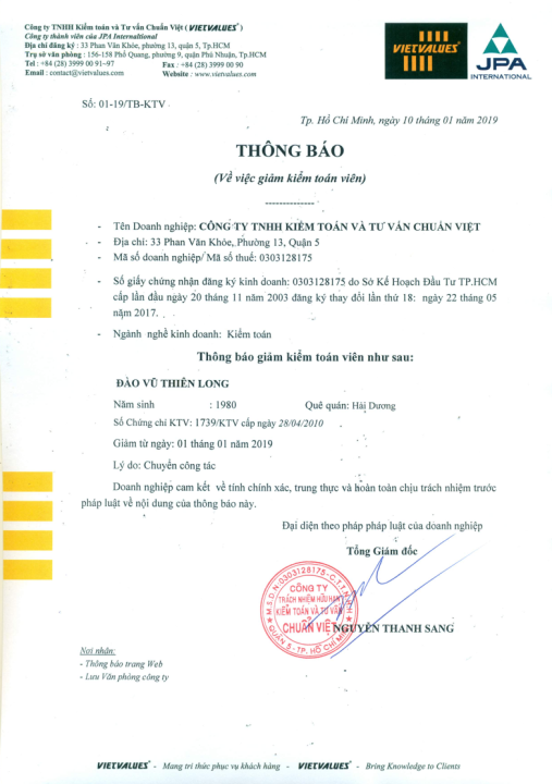 Vietvalues thông báo giảm Kiểm toán viên ngày 10/1/2019